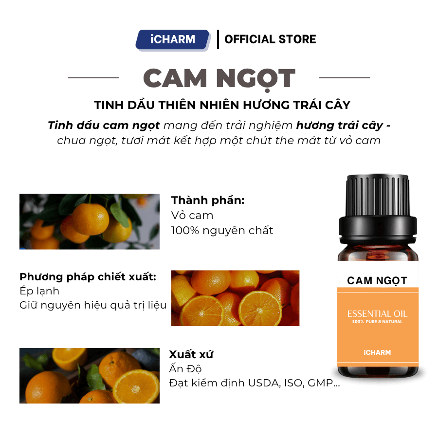 Tinh dầu Cam ngọt có một hương thơm tươi mát và ngọt ngào. Hương thơm của tinh dầu cam chủ yếu là một sự kết hợp hài hòa giữa hương tươi mát và ngọt ngào, với các note thanh mát và nhẹ nhàng.