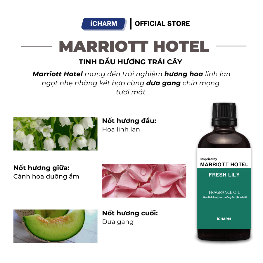 Tinh dầu khách sạn Marriott mang đến một hương thơm nhẹ nhàng và thư giãn. Hương đầu tạo ra một cảm giác nhẹ nhàng và tinh tế. Như là một dạo bước trong vườn hoa nở rộ. Hương giữa tạo nên cảm giác sảng khoái và tươi mới. Hương cuối tạo nên cảm giác thư giãn và thoải mái. Làm nổi bật sự mềm mại và tinh tế của hương thơm. Tạo nên một lớp hương cuối êm dịu và nồng nàn.